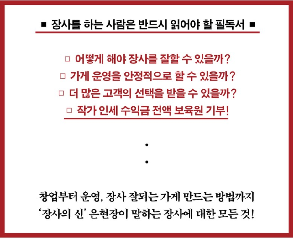 장사의 신 은현장 님이 설립한 네이버 카페입니다. 현재 약 11.7만의 회원을 보유하고 있습니다. 은현장 님의 노하우는 물론, 업종 별 예비창업주분들의 커뮤니티 공간이나 Q&A공간, 무료 홍보공간, 각 분야 전문가들의 칼럼이 연재되고 있습니다.