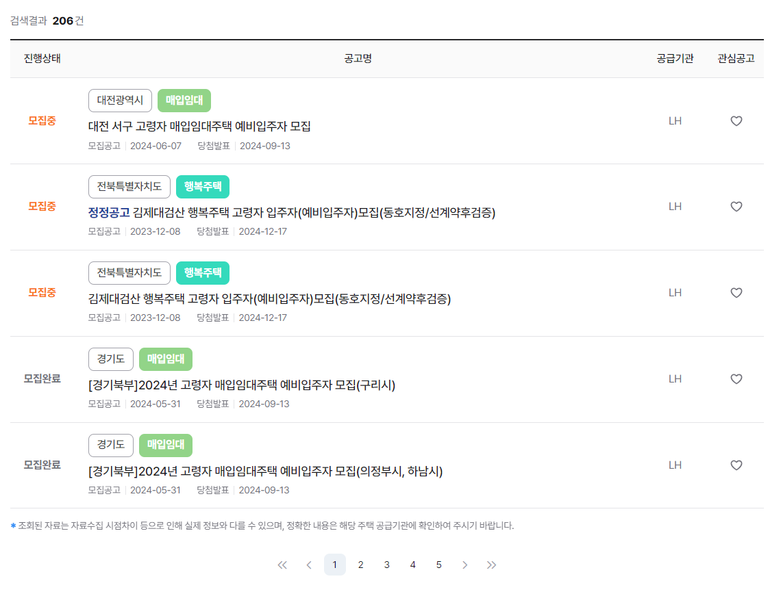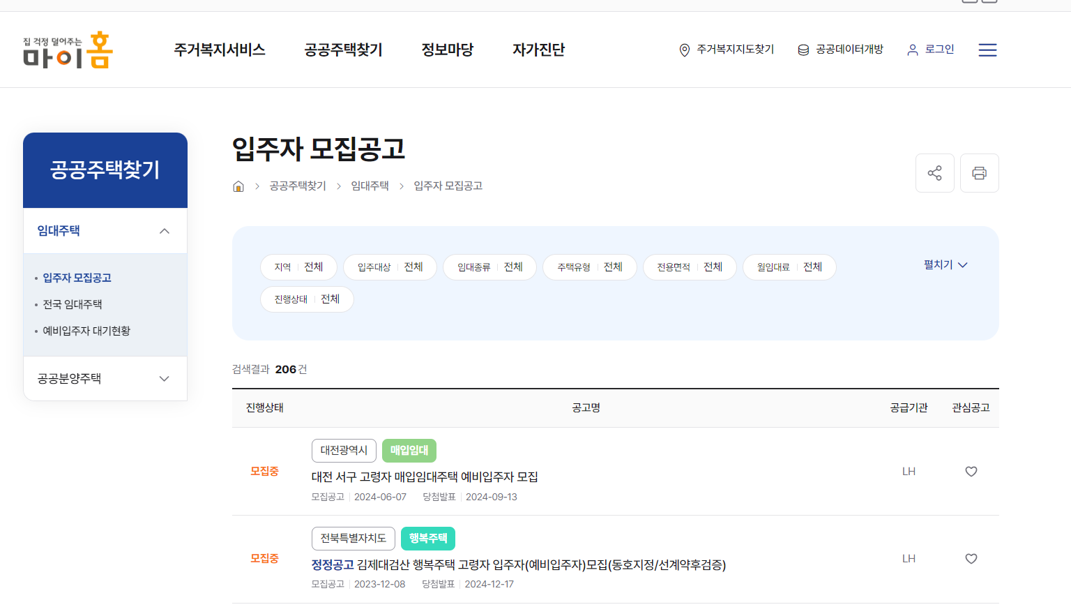 알뜰 시니어타운은 "마이홈포털" 사이트에서 신청이 가능한데요. 우선 본인이 원하는 지역에 해당 임대주택의 모집공고가 있는지를 살펴봐 주셔야 합니다.