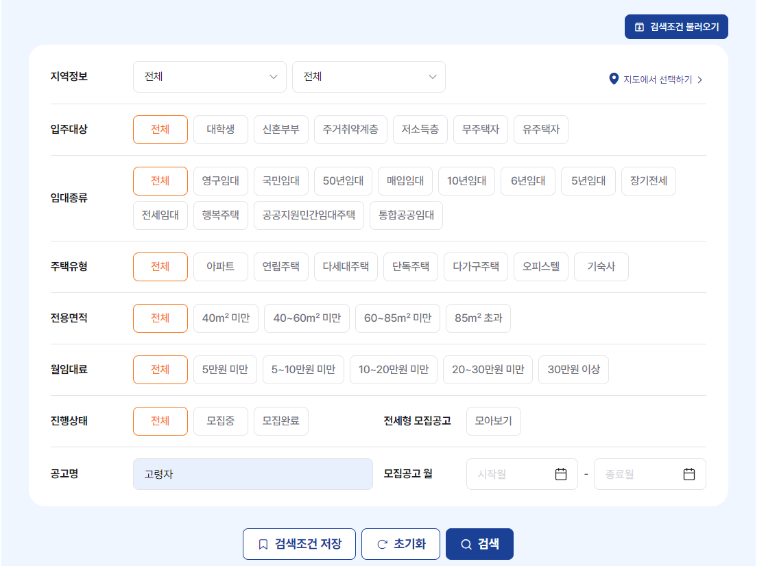 해당 검색창에서 우측에 "펼치기"를 눌러주신 후, 공고명에 "고령자"라고 검색을 해주시면 바로 확인 가능하니다.