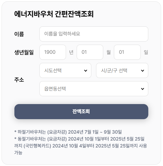 | 국민행복카드 | 동절기만 가능 | 전기, 도시가스, 등유, LPG, 연탄 | 지급 카드로 카드결제 |