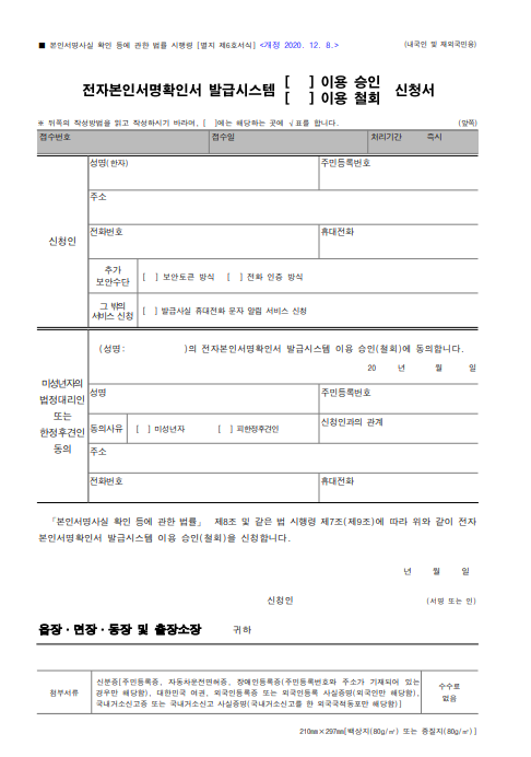 | 발급방법 | 1회 동사무소 등록 후 온라인발급 | 동사무소 방문 |