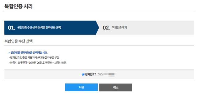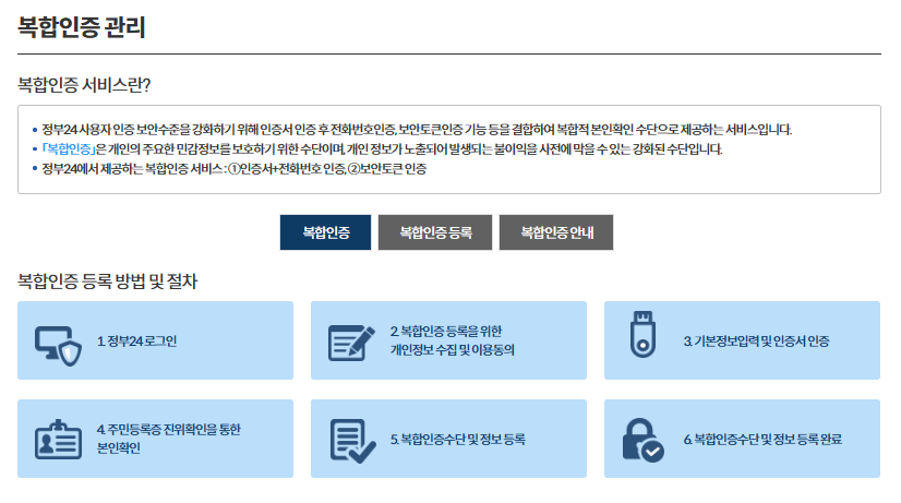 동사무소 방문 후 전화인증을 완료하셨다면 복합인증을 바로 클릭하시면 되는데요. (전화인증 사전 필수) 이후 공인인증서나 공동인증서로 로그인하신 후 전화인증을 한 번 더 해주시면 완료됩니다.
