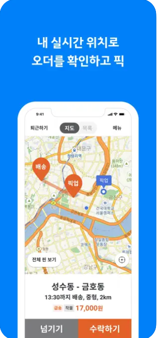 - 급송 : 운행 중 다른 퀵은 받을 수 없지만, 다른 퀵대비 운임이 고가입니다. 보통 40분 거리 내외에 2만 원 이상의 수익 가능합니다.