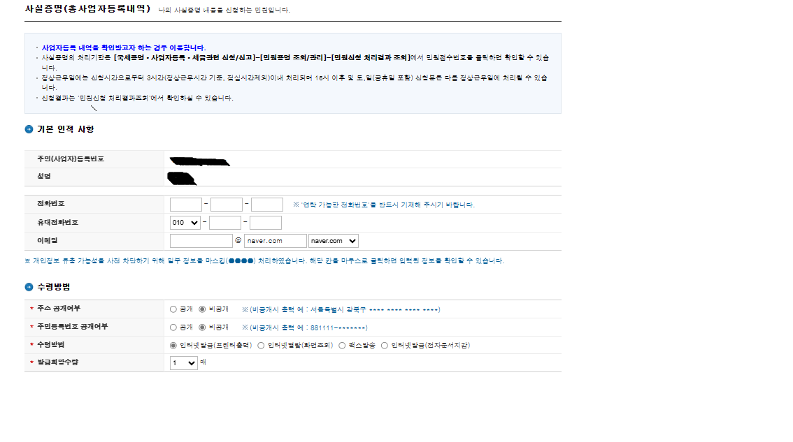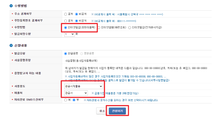 해당 서류는 온라인으로 간편하게 할 수 있으며, 사업자등록증과 함께 사업 운영에 필요한 중요한 서류인데요. 주요 이슈로는 온라인으로 간편하게 발급 받을 수 있지만, 최대 3시간의 대기시간이 필요하다는 점을 유의 부탁드립니다.