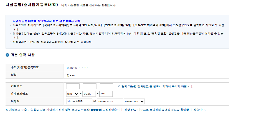 총사업자 등록내역(사실증명) 온라인 신청 및 발급 방법(홈택스), 발급가능시간