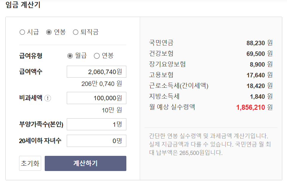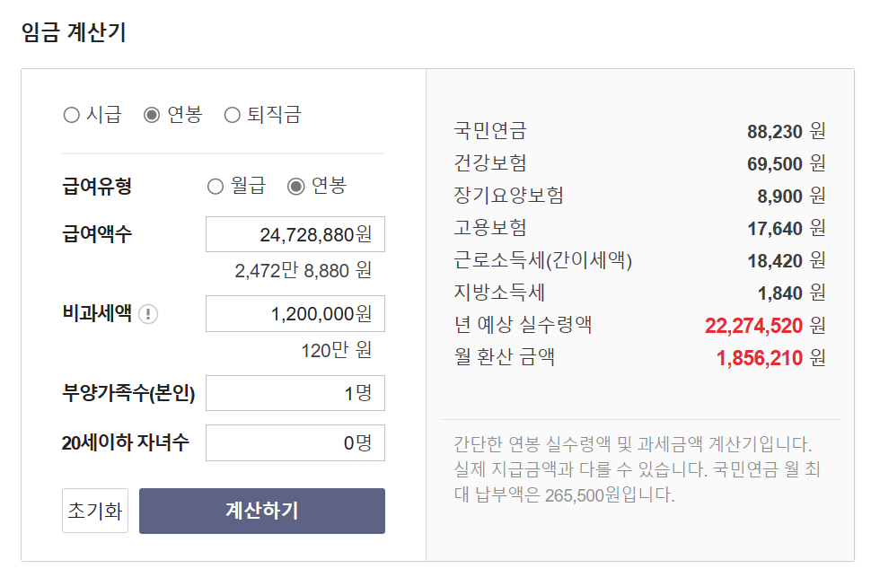 상단에서 계산된 월급을 토대로, 상단의 버튼을 클릭한 후에 급여액수를 입력해 주시면 됩니다. 그 이외에 비과세액(식대 부분) 부양가족수등을 넣으신 후 계산을 눌러주시면 실수령액이 나오게 됩니다.