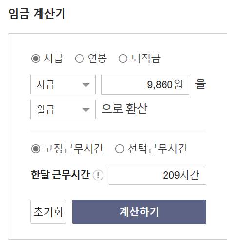 2024년 최저시급이 9,860원으로 확정되었으니, 이를 기준으로 월급을 계산해 보겠습니다. 상단의 링크를 클릭하신 후, 시급으로 변경, 한 달 근무시간을 입력하시면 간단하게 확인이 가능하신데요.