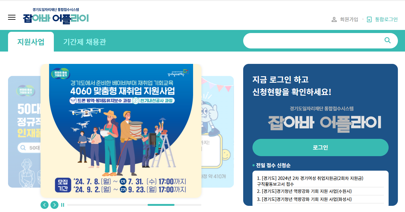 신청은 경기도 일자리재단 통합저수시스템인 "잡아바 어플라이"를 통한 온라인 접수 한정으로 진행되게 됩니다.