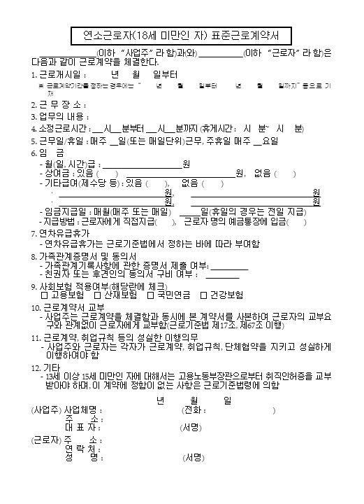| 3 | 연소근로자(18세 미만인 자) 표준근로계약서 | 연소근로자 계약서 다운로드 |