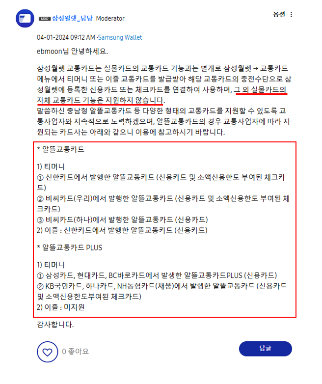 삼성월렛에서 내놓은 공식답변도 하단과 같습니다.